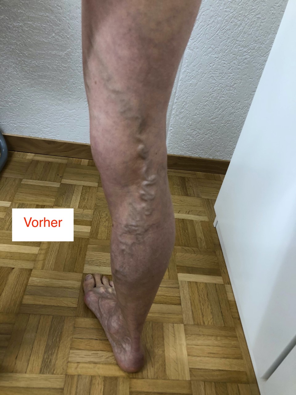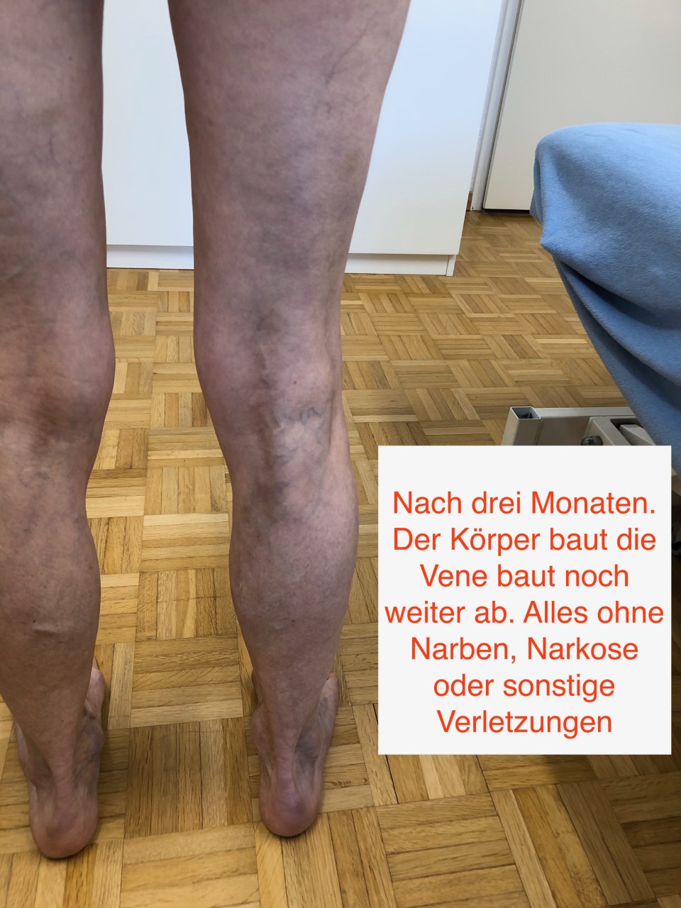 Die Krampfaderentfernung mit Kochsalzlösung ist wenig belastend für den Patienten – es gibt keinen operativen Eingriff und keine Hautschnitte. Wickeln und Stützstrümpfe sind bei dieser Methode überflüssig! Zuerst erfolgt eine optische und manuelle Voruntersuchung des betroffenen Beines, eine Ultraschalluntersuchung sowie die Aufklärung des Patienten. Bei der anschließend ambulant durchgeführten Behandlung wird konzentrierte Kochsalzlösung in die betroffene Krampfader injiziert – dadurch kommt es zu einer starken Reizung der geschädigten Innenschicht der Krampfader und zu einem Verschluss des Gefäßes. In weiterer Folge bildet sich innerhalb von wenigen Tagen ein fester Strang, der in den darauffolgenden Monaten vom Körper selbst vollständig abgebaut wird. Auf diese Weise können nicht nur die Hauptäste der Krampfader verschlossen werden, sondern auch die Seitenäste, wodurch das Risiko einer Neubildung deutlich reduziert wird.